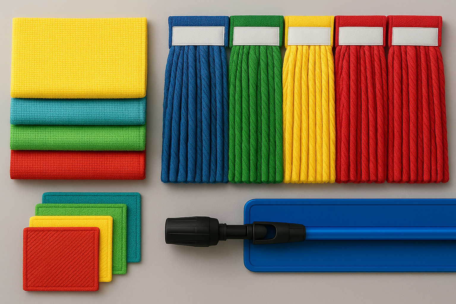 Adopt color-coded microfiber, assign tools per zone, and train on proper chemical dilution.